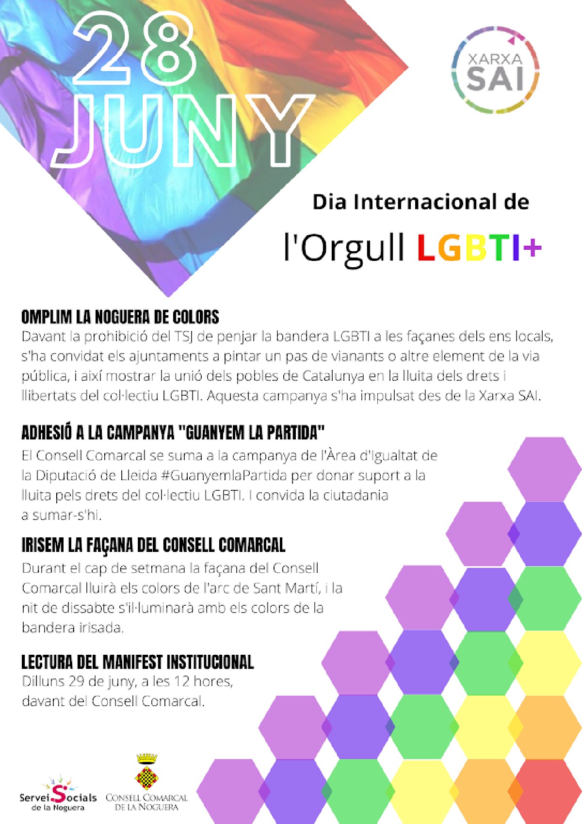 Balaguer es suma als actes amb motiu del Dia Internacional de l'Orgull LGBTI, que es commemora el dia 28 de juny. També el Consell Comarcal de la Noguera es suma a les reivindicacions i ho farà irisant la seva façana.