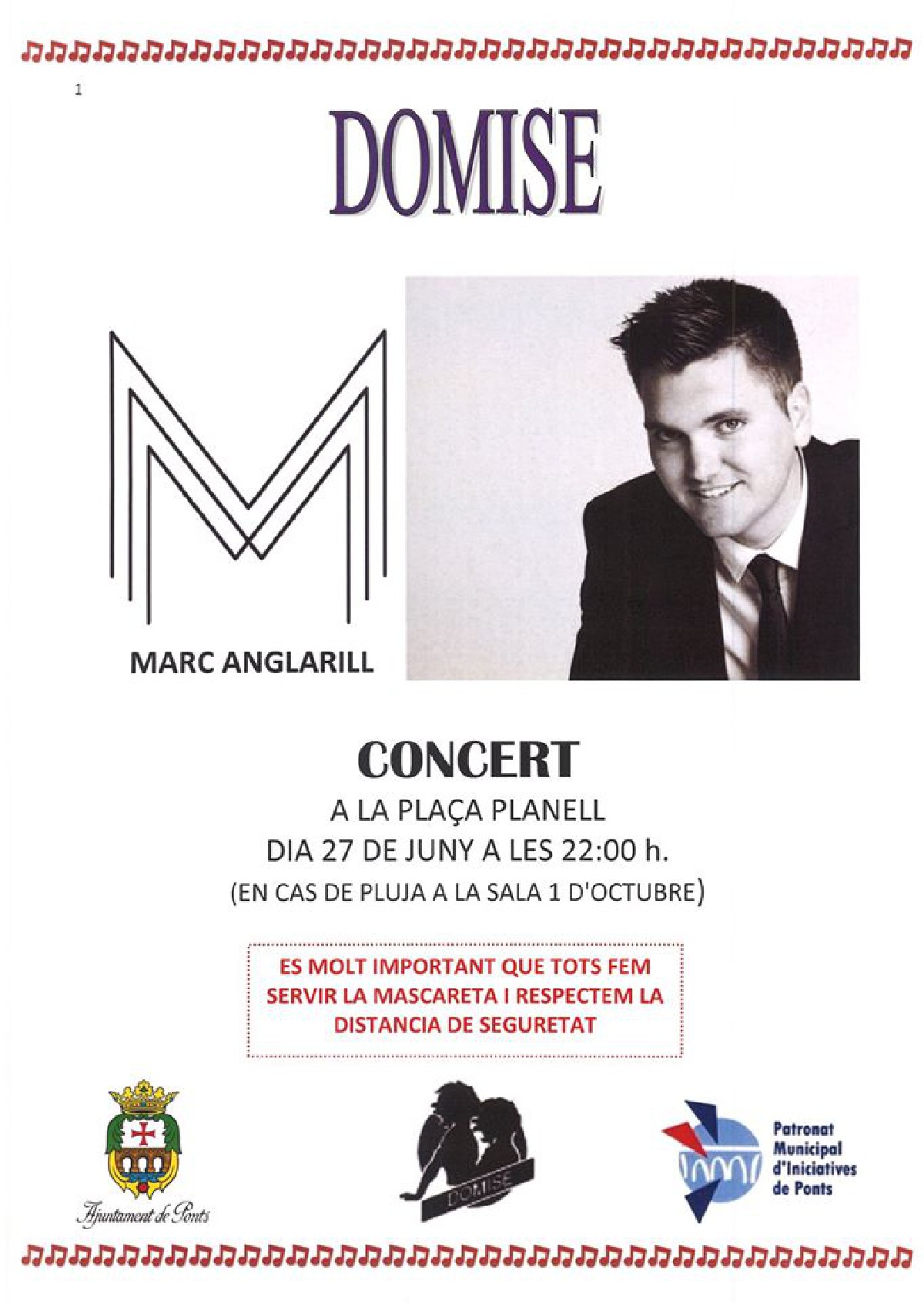 Ponts programa un concert de Marc Anglarill aquest dissabte 27 de juny. Serà a la Plaça Planell a les 10 de la nit i amb estrictes mesures de seguretat.