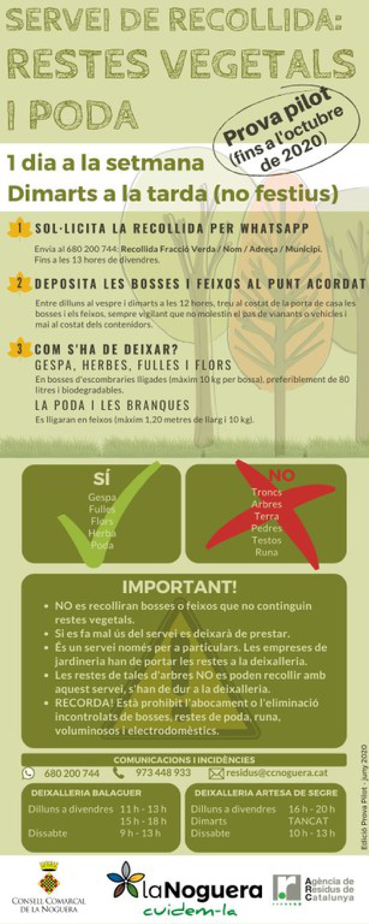 A partir d'aquest dimarts dia 9 de juny, el Consell Comarcal de la Noguera ofereix un nou servei de recollida selectiva de residus. Es tracta d'un servei que recull les restes vegetals i de poda generades per particulars
