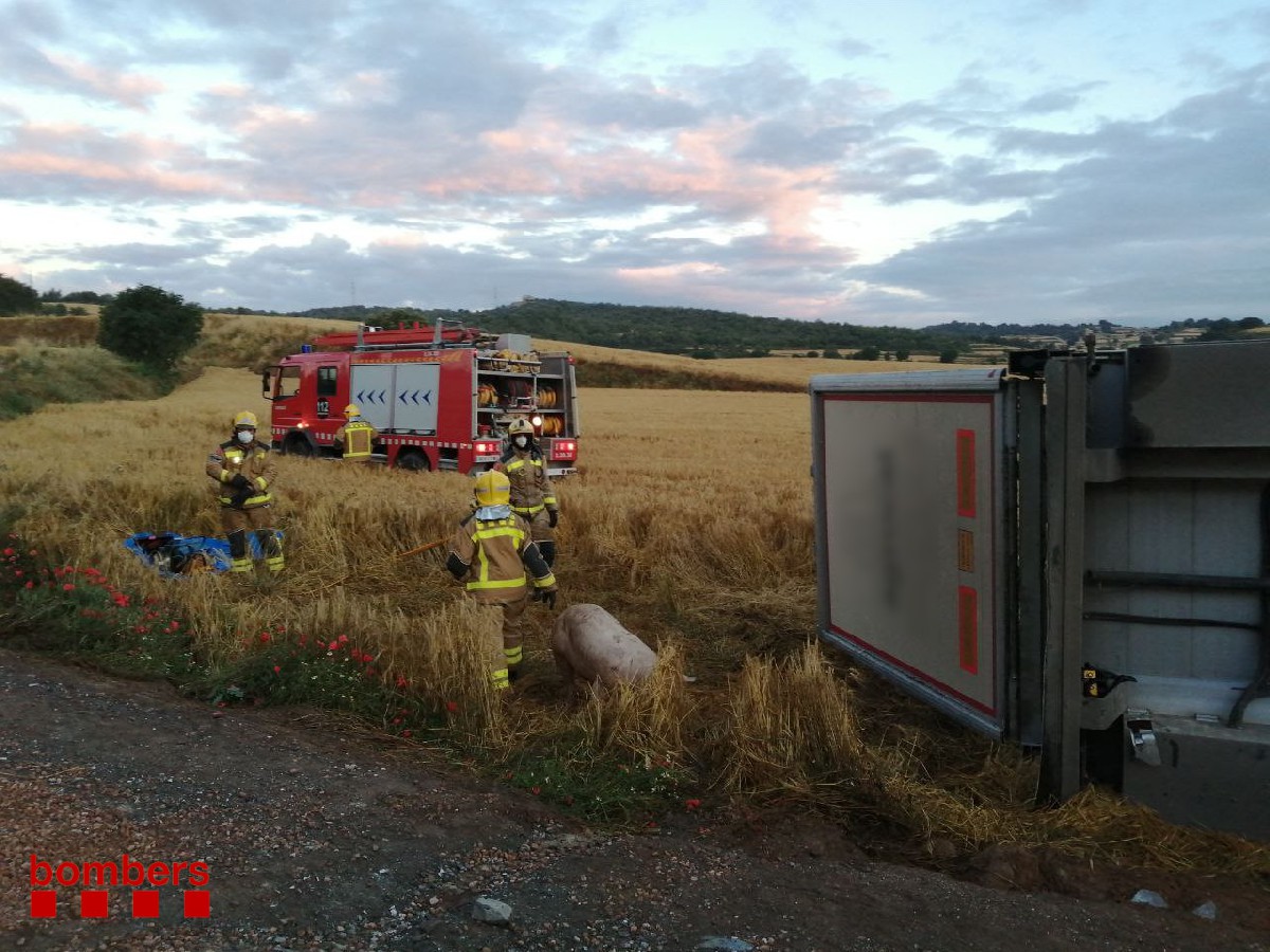 Un camió de porcs ha bolcat aquest dilluns a Oliola. El conductor ha resultat il·lès, però bombers i veterinaris han hagut d'activar-se per recollir els animals.