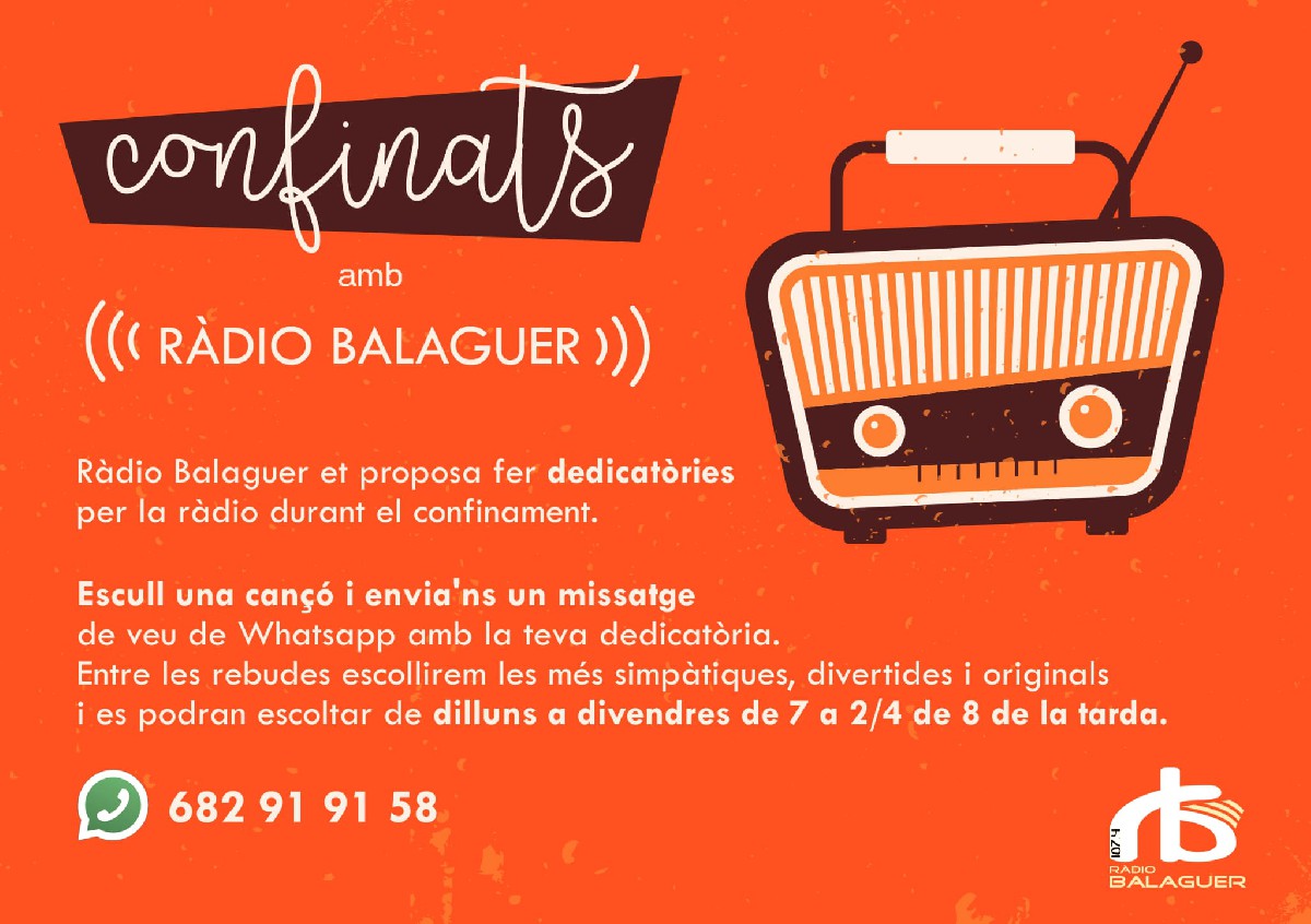 Ràdio Balaguer et proposa, a partir d'aquest dimarts, fer dedicatòries per la ràdio durant el confinament. Fes la teva felicitació, escull una cançó i escolta la teva dedicatòria de dilluns a divendres de 19h a 19.30h