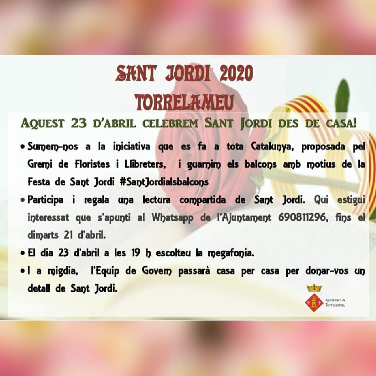 Torrelameu guarnirà finestres i balcons per Sant Jordi, i farà una lectura compartida amb els veïns per la megafonia del municipi.