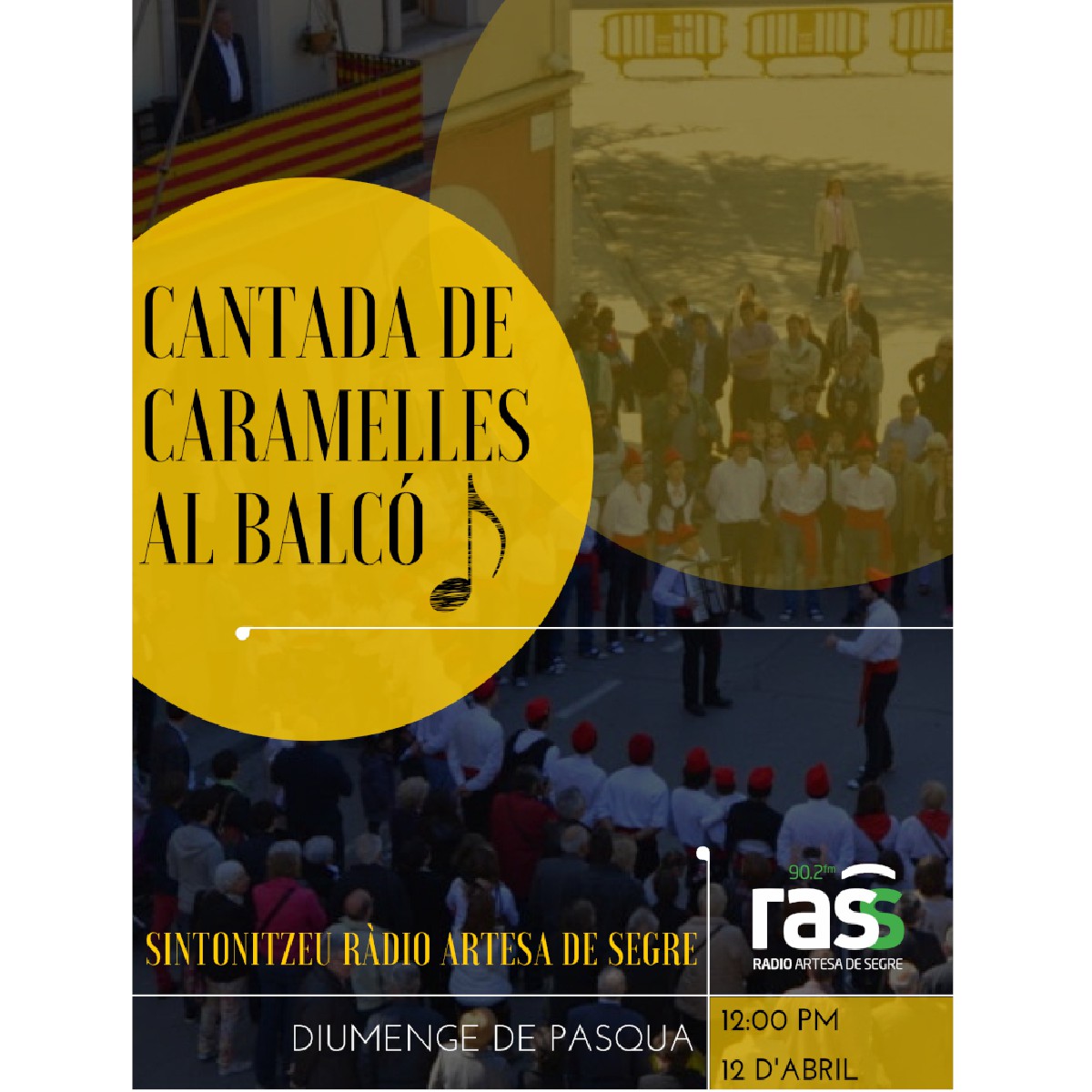 El Grup de Caramelles La Dàlia Blanca d'Artesa de Segre organitza per aquest diumenge a les 12h una 'CANTADA DE CARAMELLES AL BALCÓ'.