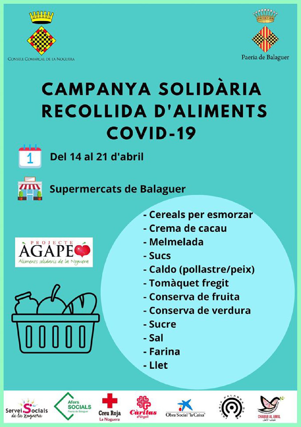 Recollida solidària d'aliments per a famílies de la Noguera del 14 al 21 d'abril a supermercats de Balaguer. La recollida es fa conjuntament amb la paeria de Balaguer, Mossos d'Esquadra, Policia Local, Càritas, Creu Roja i altres entitats.