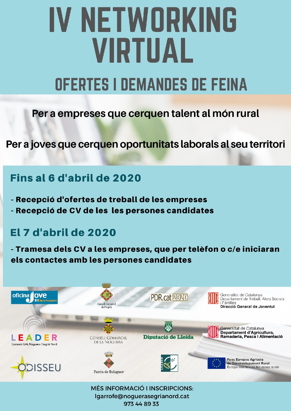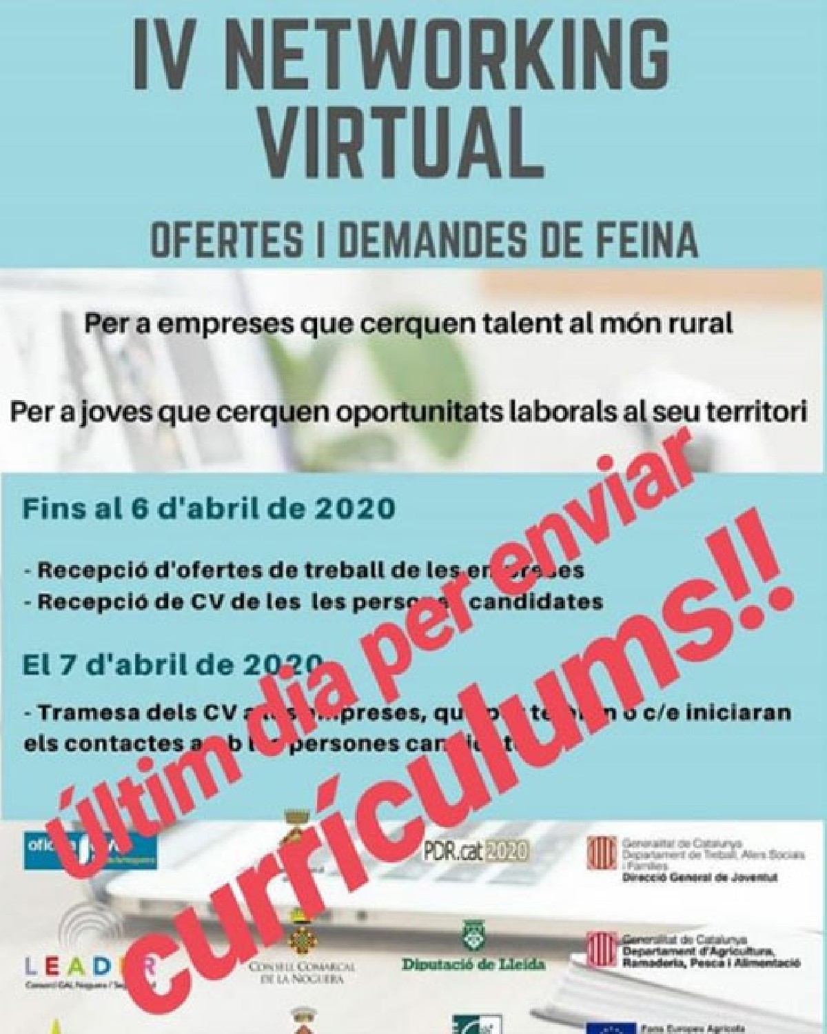 Aquest dilluns 6 d'abril acaba el termini per inscriure's a la IV Networking Virtual de la Noguera, adreçada a joves que cerquin feina i empreses que busquin talent al món rural.