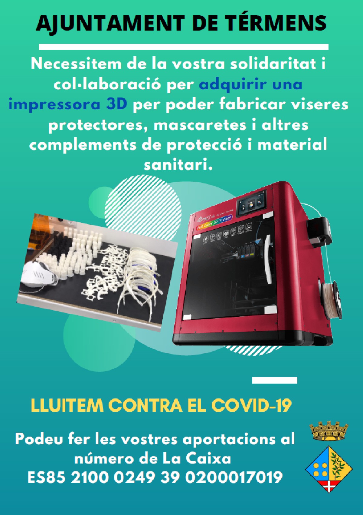 L'ajuntament de Térmens inicia una campanya de recollida de fons entre els ciutadans, per adquirir una impressora 3D i poder fabricar material de protecció per al personal sanitari.