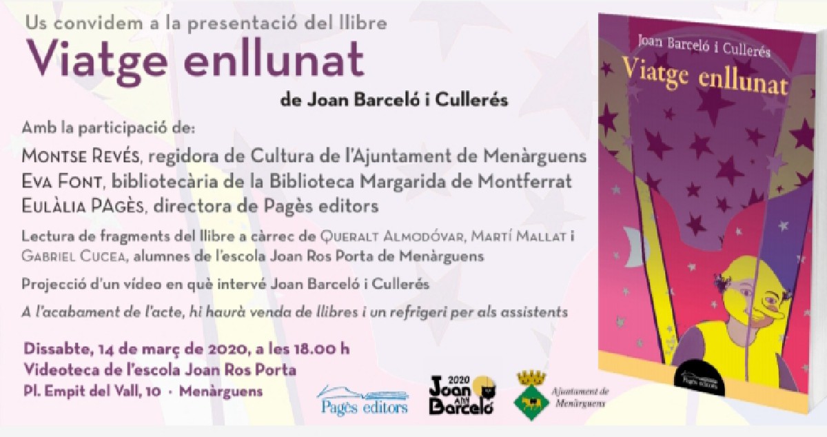 Aquest dissabte 14 de març es presentarà a Menàrguens el llibre 'Viatge enllunat' de Joan Barceló i Cullerés. Es tracta d'un acte dins de l'Any Joan Barceló.