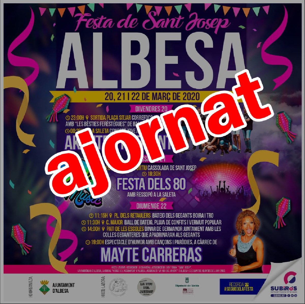 Albesa ajorna tots els actes de la Festa de Sant Josep previstos pels dia 19, 20, 21 i 22. El municipi ajorna també tots els actes de l'agenda cultural i esportiva previstos per aquest mes de març, i que organitza l'Ajuntament.