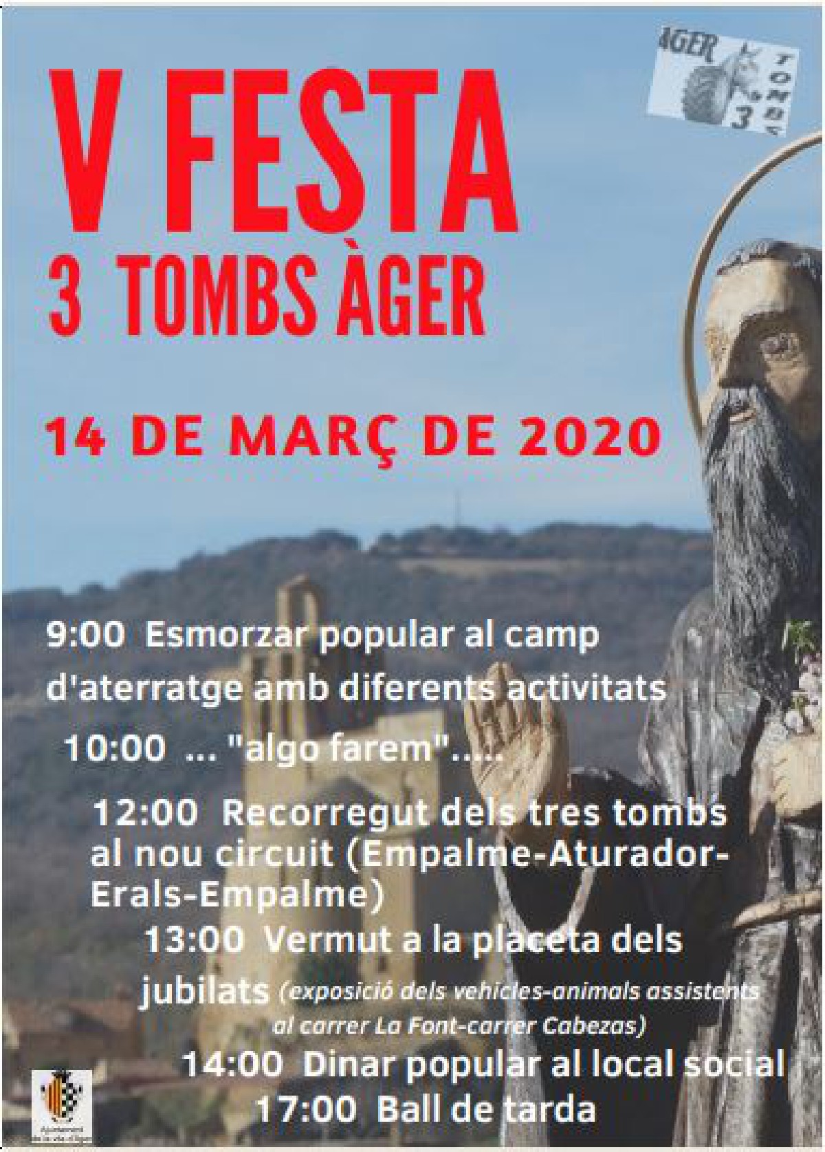 Àger celebrarà aquest dissabte 14 de març la 5a edició dels seus Tres Tombs, amb canvis pel coronavirus. Els actes es limitaran al matí, amb l'esmorzar, les exhibicions i els Tres Tombs. Es suspenen el dinar i el ball de tarda.