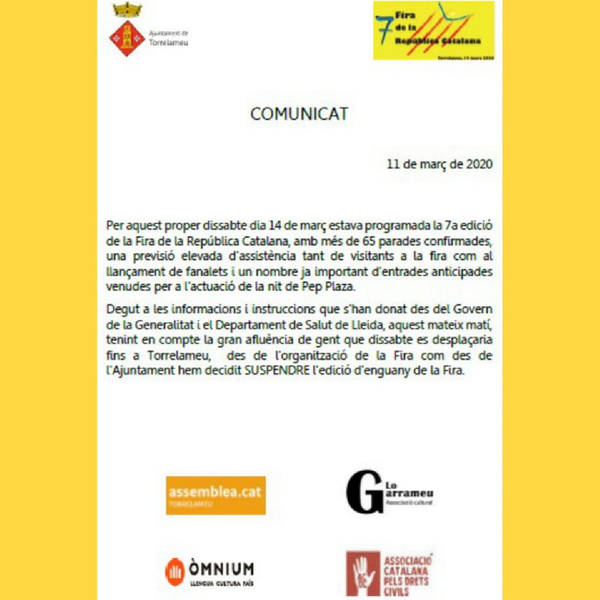 Torrelameu suspèn la 7a Fira de la República Catalana, que s'havia de celebrar aquest dissabte 14 de març. Organització i ajuntament han pres la decisió després de les afectacions del coronavirus.