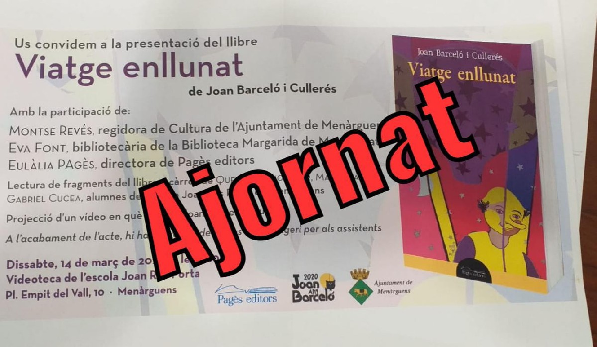 Menàrguens ajorna la presentació del llibre 'Viatge enllunat' de Joan Barceló i Cullerés, que s'havia de fer aquest dissabte 14 de març a la videoteca de l'escola Joan Ros Porta.