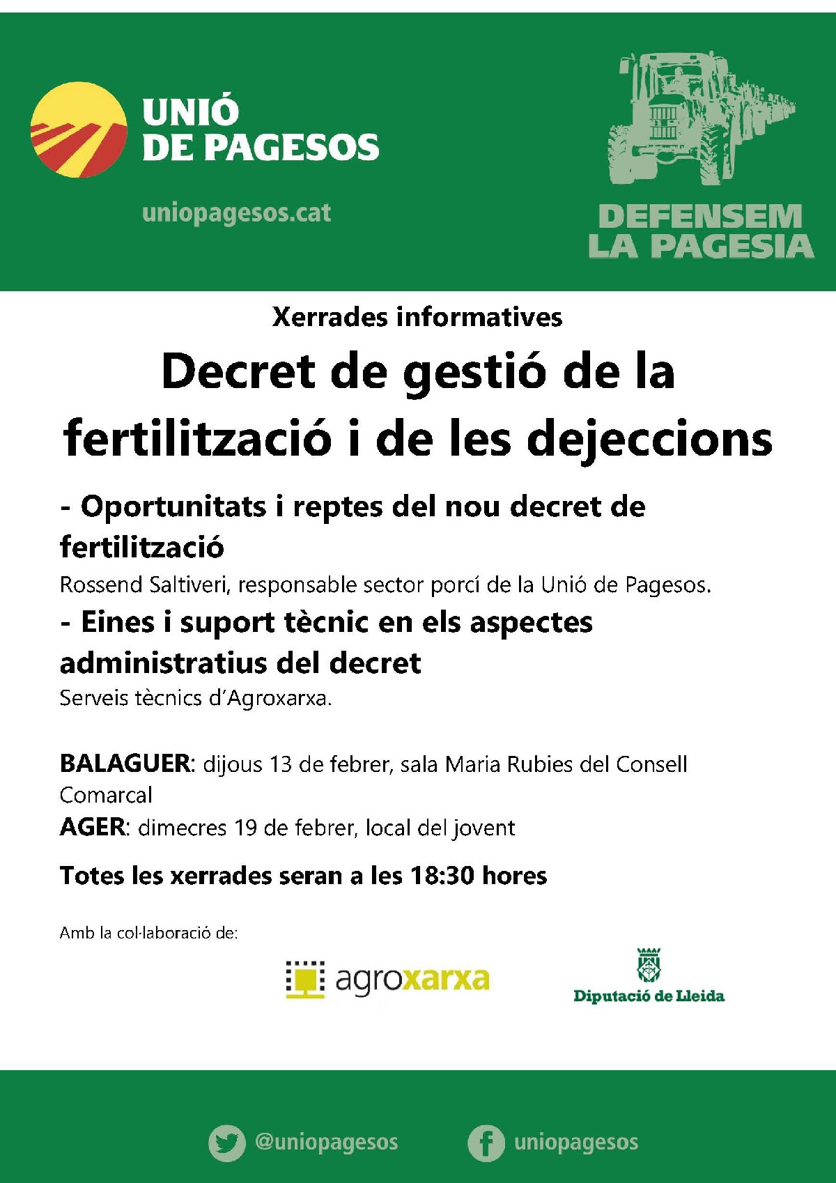Unió de Pagesos organitza la xerrada 'Decret de gestió de fertilització i de les dejeccions ramaderes'. Es farà aquest dijous 13 de febrer, a les 18.30 h, a la Sala Maria Rúbies del Consell Comarcal de la Noguera.