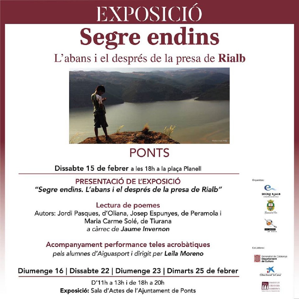 Aquest dissabte 15 de febrer a les 6 de la tarda s'inaugurarà a Ponts l'exposició 'Segre endins'. Es tracta d'una mostra de l'abans i el després de la presa de Rialb. La inauguració comptarà amb una performance de teles acrobàtiques i música.