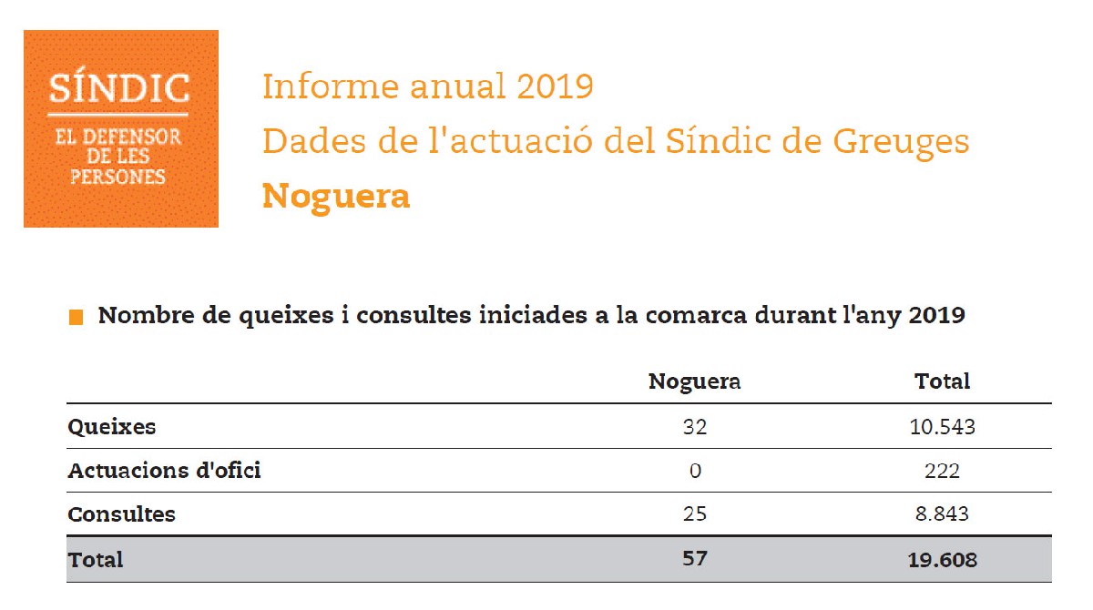 El 2019 el Síndic va atendre 32 queixes i 25 consultes a la comarca de la Noguera. El Síndic reivindica la garantia dels drets socials, la sostenibilitat i la defensa de les llibertats davant la vulnerabilitat creixent, el canvi climàtic i l'erosió de dre