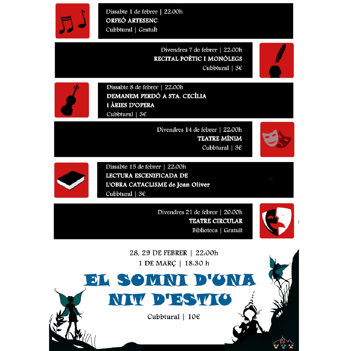 Artesa de Segre estrena aquest dissabte els actes del Mes Cultural, que oferirà durant el febrer concerts, teatre i recitals. Aquest dissabte es farà l'espectacle Concert i Poesia de l'Orfeó Artesenc, al Cubbtural, a les 10 de la nit.