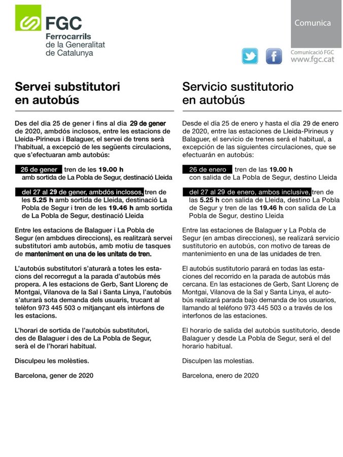La línia de tren de Lleida - La Pobla continua amb servei substitutori amb autobús entre Balaguer i La Pobla de Segur fins al dimecres 29 de gener. L'incidència afecta també alguns horaris entre Balaguer i Lleida.