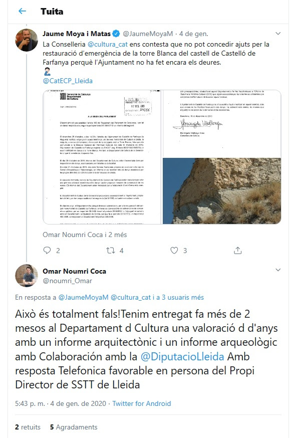 ECP Diputació de Lleida demana explicacions per la contradicció amb la Generalitat amb l'ajut a Castelló de Farfanya pels danys patits, després d'un episodi de pluges, al conjunt arqueològic i arquitectònic del municipi