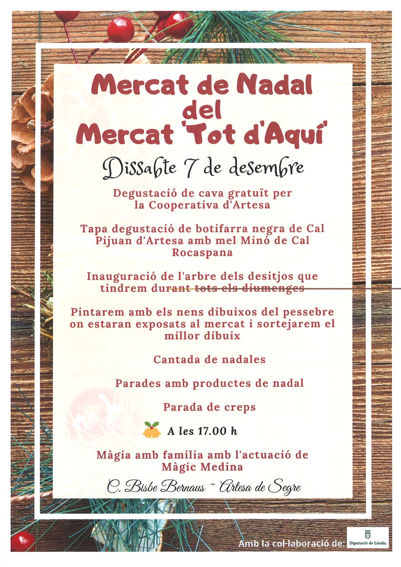 Aquest cap de setmana Artesa de Segre ofereix els seus mercats de Nadal. Dissabte és el torn del mercat Tot d'Aquí al carrer Bisbe Bernaus, i diumenge el mercat de Nadal del comerç, a la plaça de l'ajuntament.