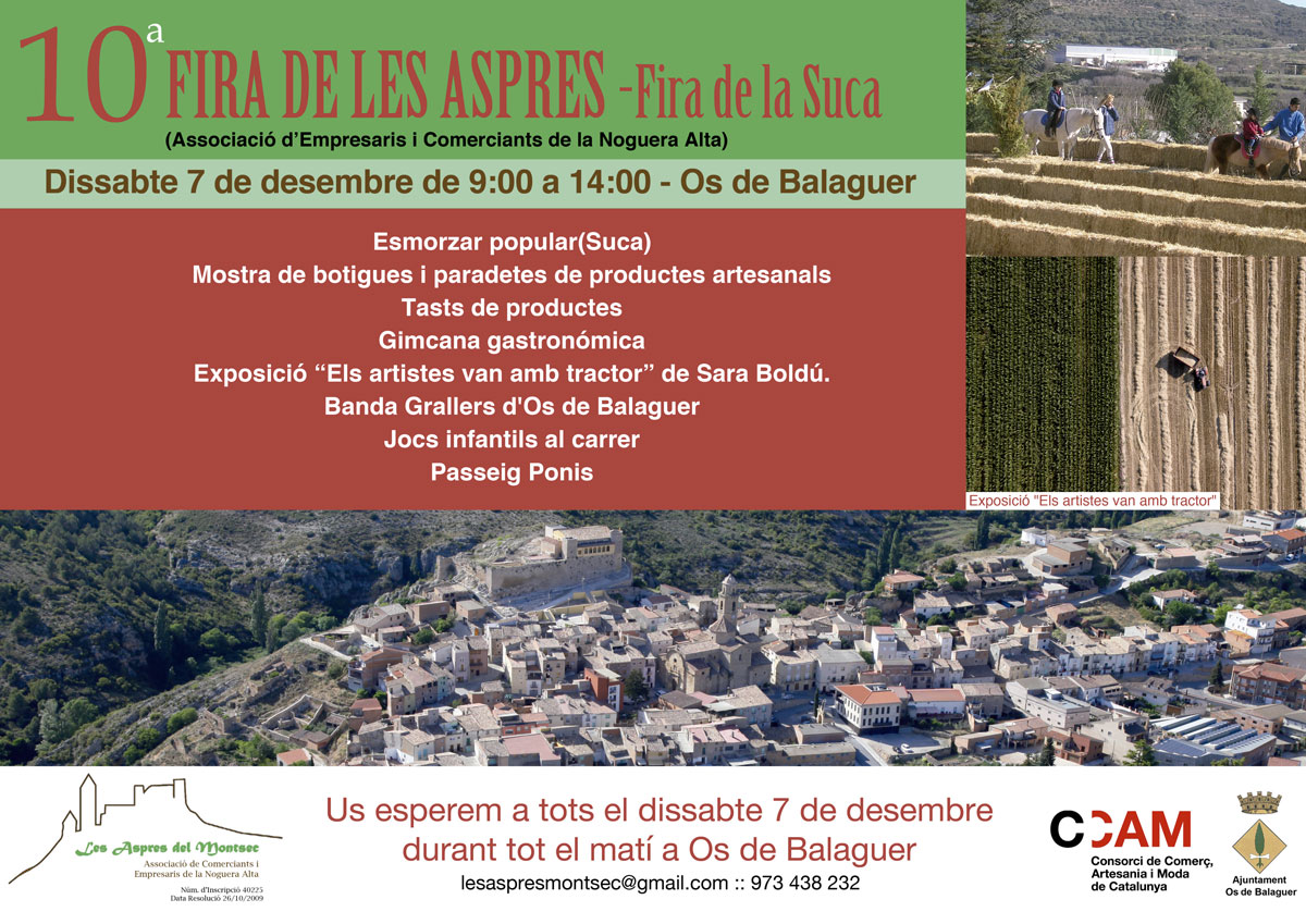 El dissabte dia 7 de desembre torna la Fira de les Aspres Fira de la Suca a Os de Balaguer. La fira inclourà la GastroKhana, una gimcana gastronòmica que premiarà el guanyador amb un lot de productes del Montsec.