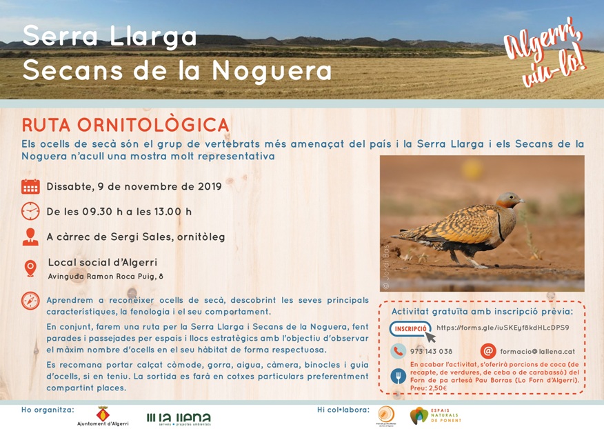 Algerri organitza aquest dissabte 9 de novembre una ruta ornitològica gratuïta per descobrir els ocells de secà, el grup de vertebrats més amenaçats del país.