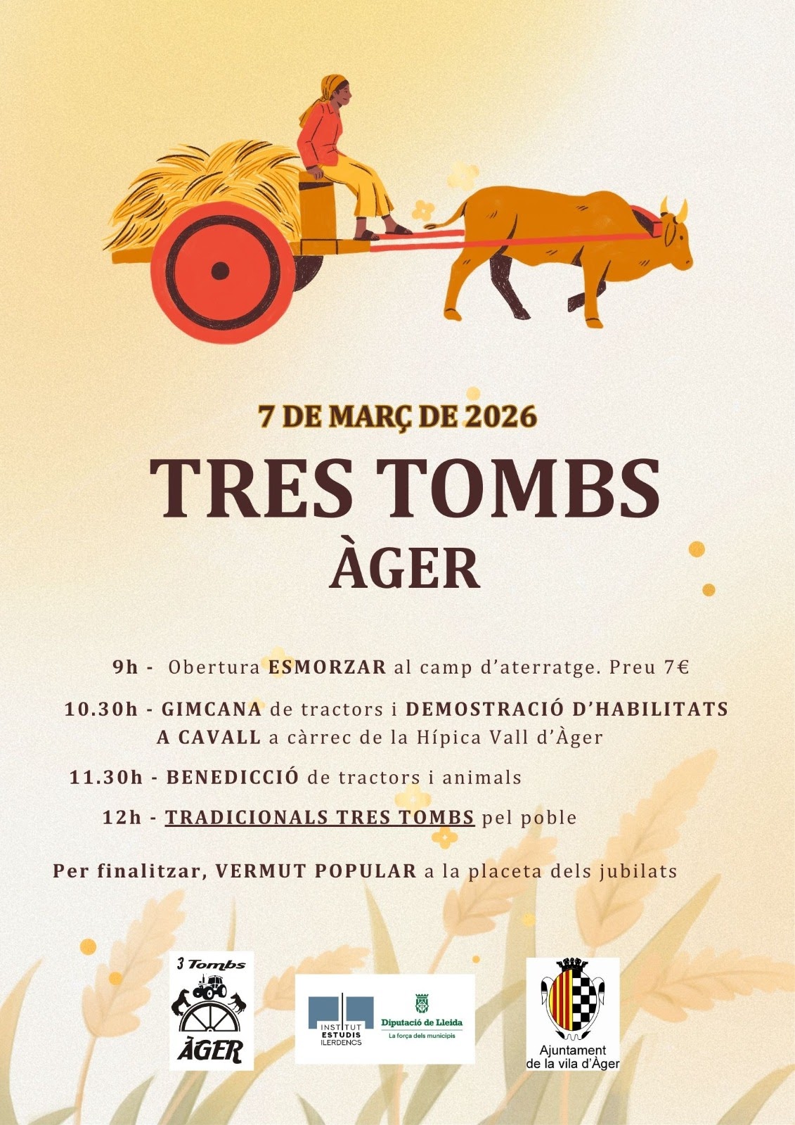 Àger celebrarà el proper dissabte 7 de març la tradicional festa dels Tres Tombs, que arriba a la 9a edició. L’esmorzar popular, la gimcana de tractors i cavalls, la benedicció i els Tres Tombs seran els actes destacats