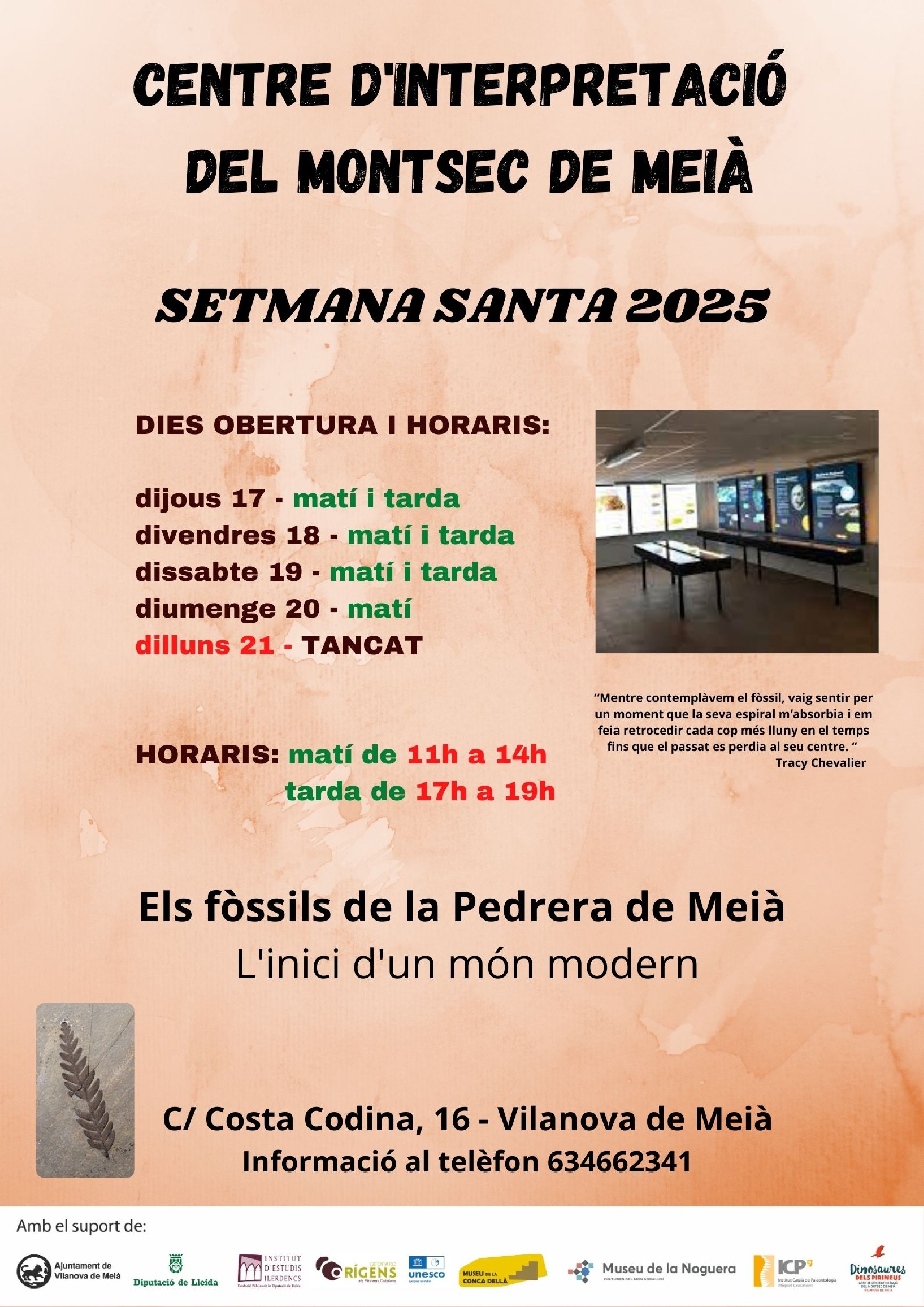 El Centre d'Interpretació del Montsec de Meià, ubicat a Vilanova de Meià, obrirà les seves portes durant els dies festius de Setmana Santa amb un horari especial per a tots aquells que vulguin conèixer el patrimoni geològic i paleontològic de la zona