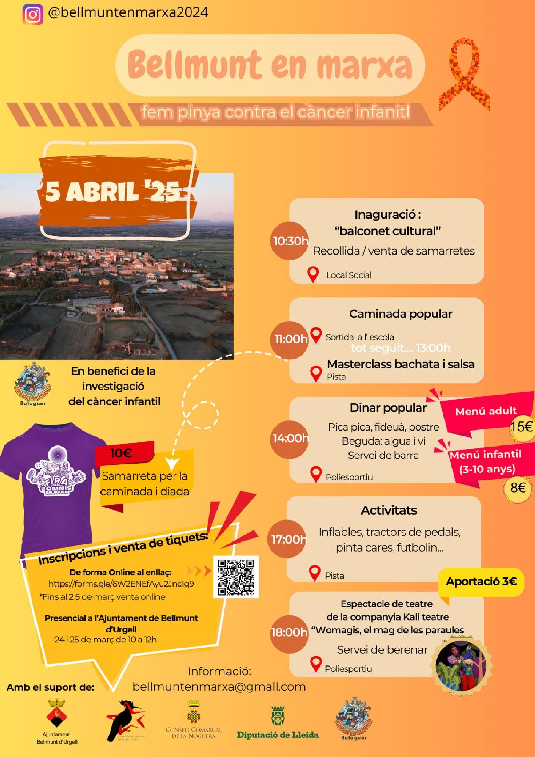 Bellmunt d'Urgell es torna a bolcar en la lluita contra el càncer infantil amb una nova edició de la jornada solidària 'Bellmunt en marxa: Fem pinya contra el càncer infantil', que tindrà lloc aquest dissabte 5 d'abril
