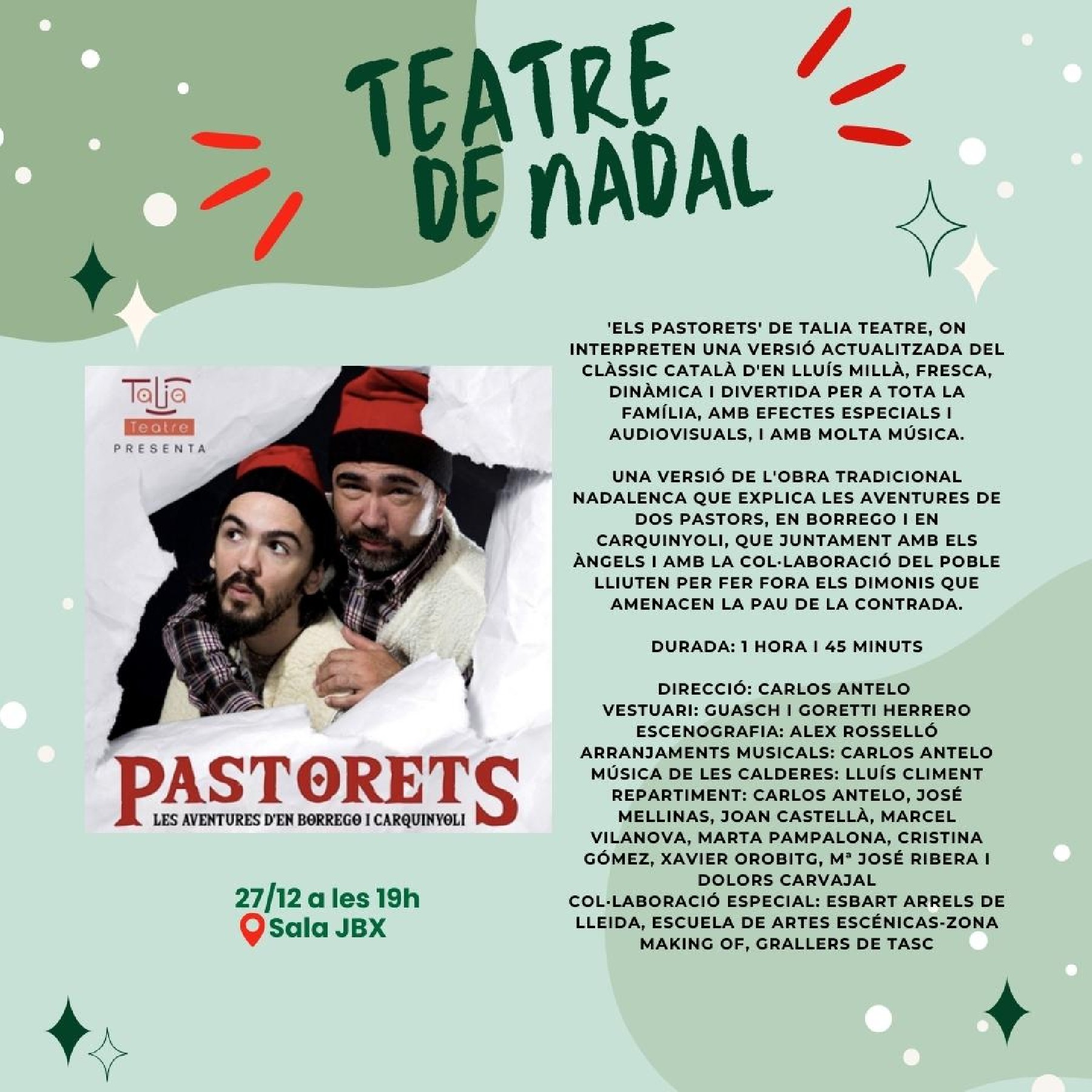 Aquest divendres dia 27 de desembre a les 19 h, la Sala JBX de Menàrguens acollirà la representació d'una versió actualitzada i dinàmica del clàssic català 'Els Pastorets', de Lluís Millà, a càrrec de la companyia Talia Teatre