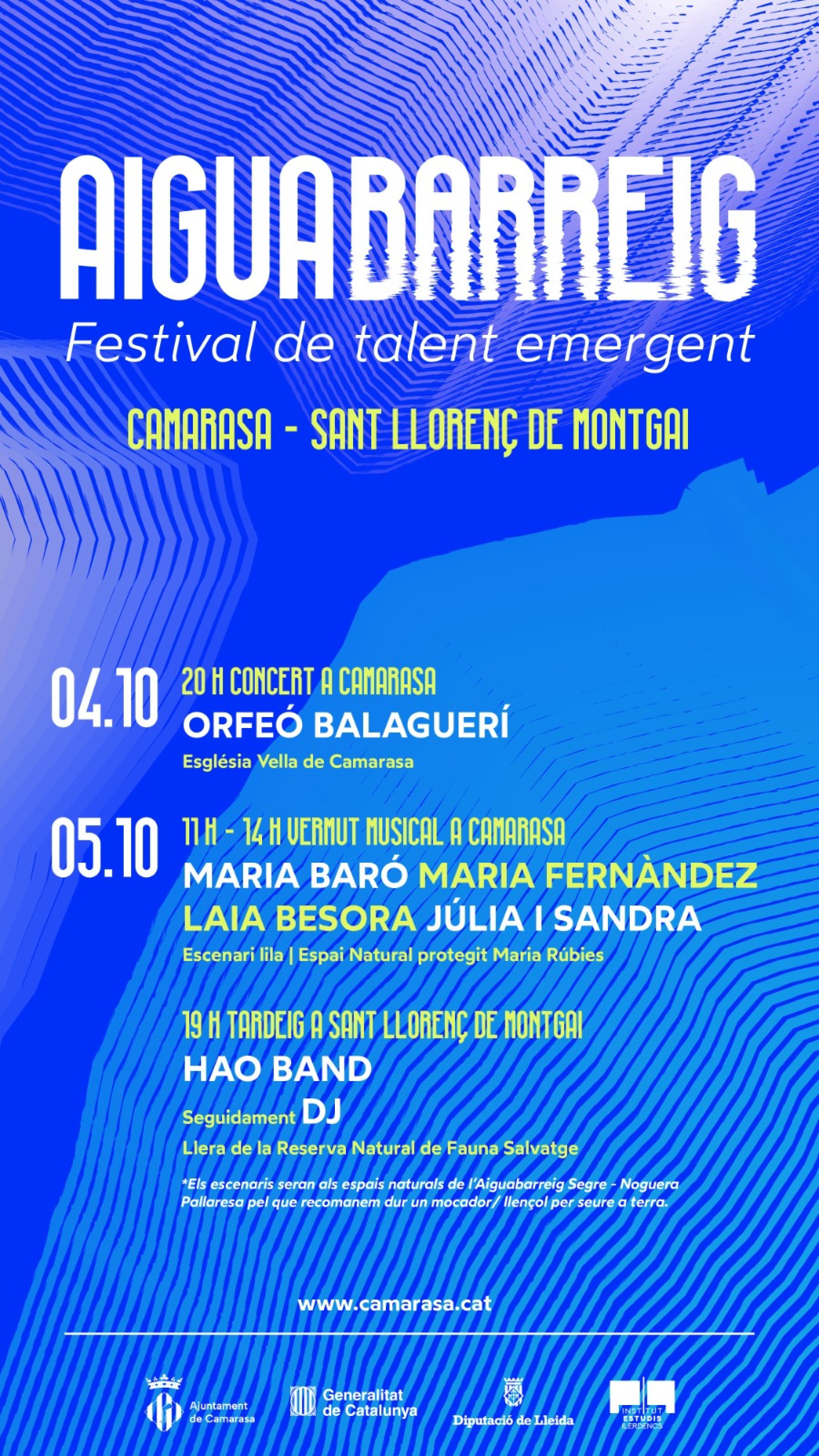 Natura, patrimoni històric, gastronomia i música de talent emergent, es trobaran a 'Aiguabarreig, festival de talent emergent', que se celebrarà aquest dissabte 5 d'octubre a l'espai natural de l'Aiguabarreig, a Camarasa i Sant Llorenç de Montgai