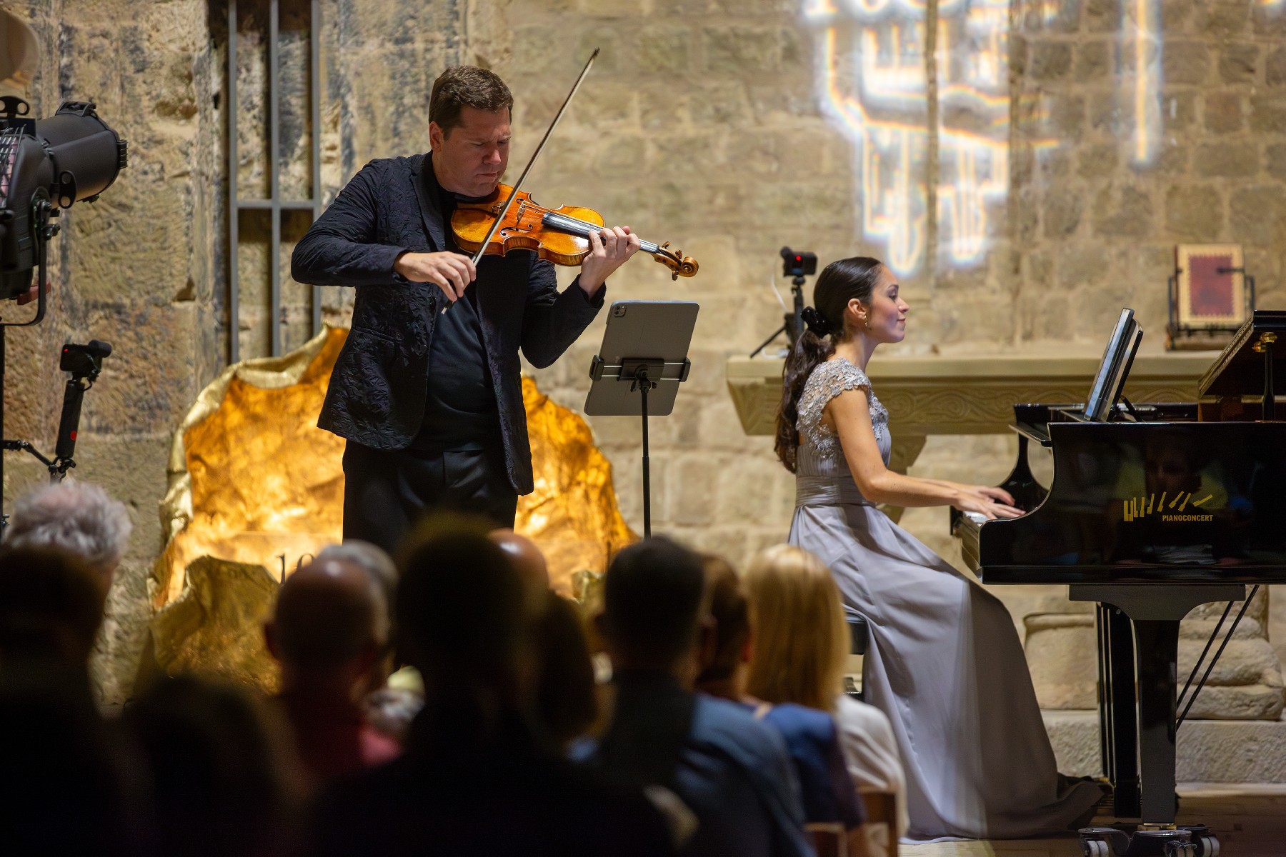La col·legiata de Sant Pere s'omple per escoltar el duet del violinista Abel Tomàs i la pianista Emma Stratton