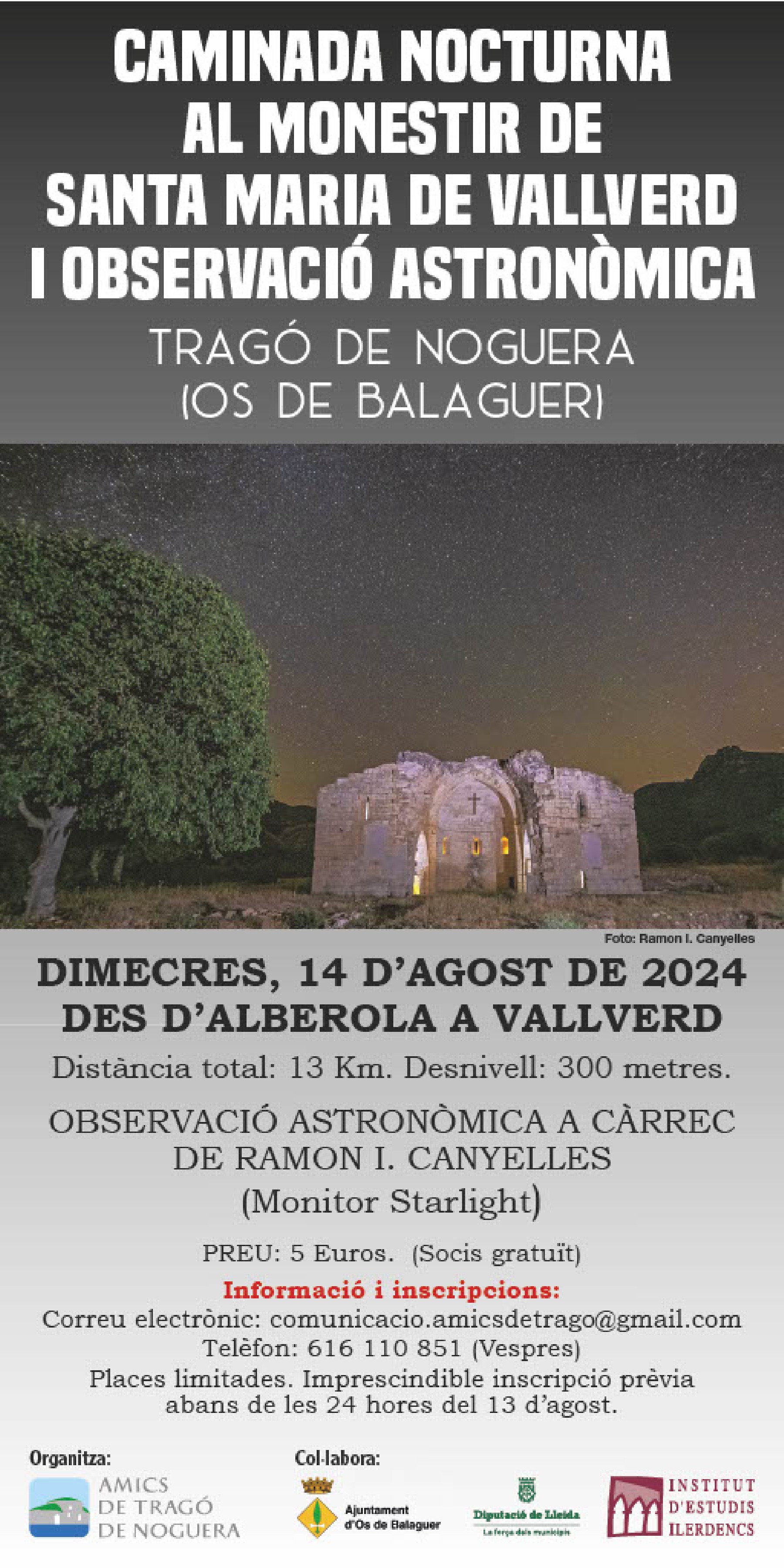 El proper dimecres 14 d'agost, se celebrarà una caminada nocturna amb finalitats astronòmiques, organitzada pels Amics de Tragó de Noguera