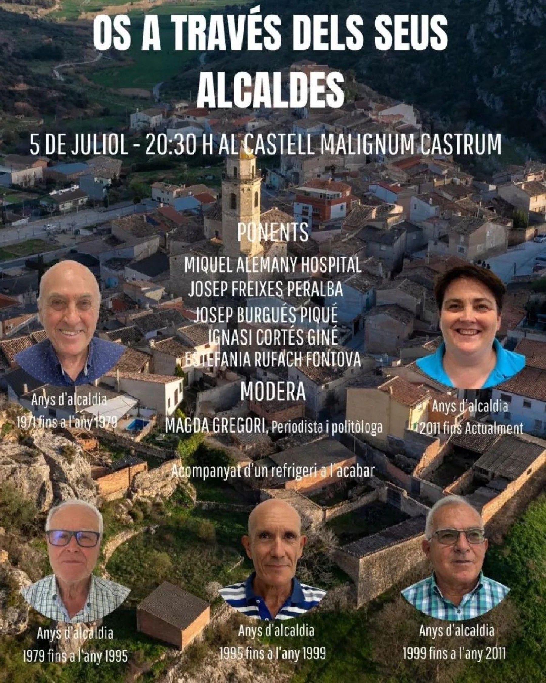 Aquest divendres 5 de juliol a les 20.30 h, el Castell Malignum Castrum acollirà la conferència-xerrada 'Os a través dels seus Alcaldes', una jornada que comptarà amb la participació de 5 alcaldes d'Os de Balaguer en aquest darrers anys