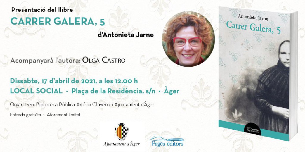 Aquest dissabte a les 12 del migdia i al local social ubicat a la Plaça de la Residència d'Àger es presentarà el llibre 'Carrer Galera, 5', de l'escriptora lleidatana Antonieta Jarne