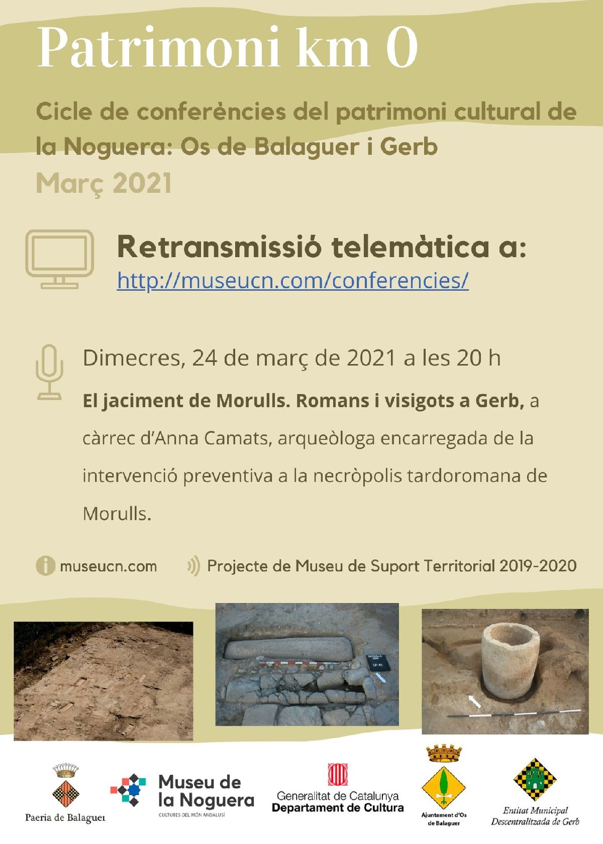 Aquest dimecres tindrà lloc l'última de les conferències del cicle 'Patrimoni Km 0'. Tractarà sobre 'El jaciment dels Morulls. Romans i Visigots a Gerb' a càrrec de l'arqueòloga Anna Camats i es podrà seguir online a partir de les 8 del vespre