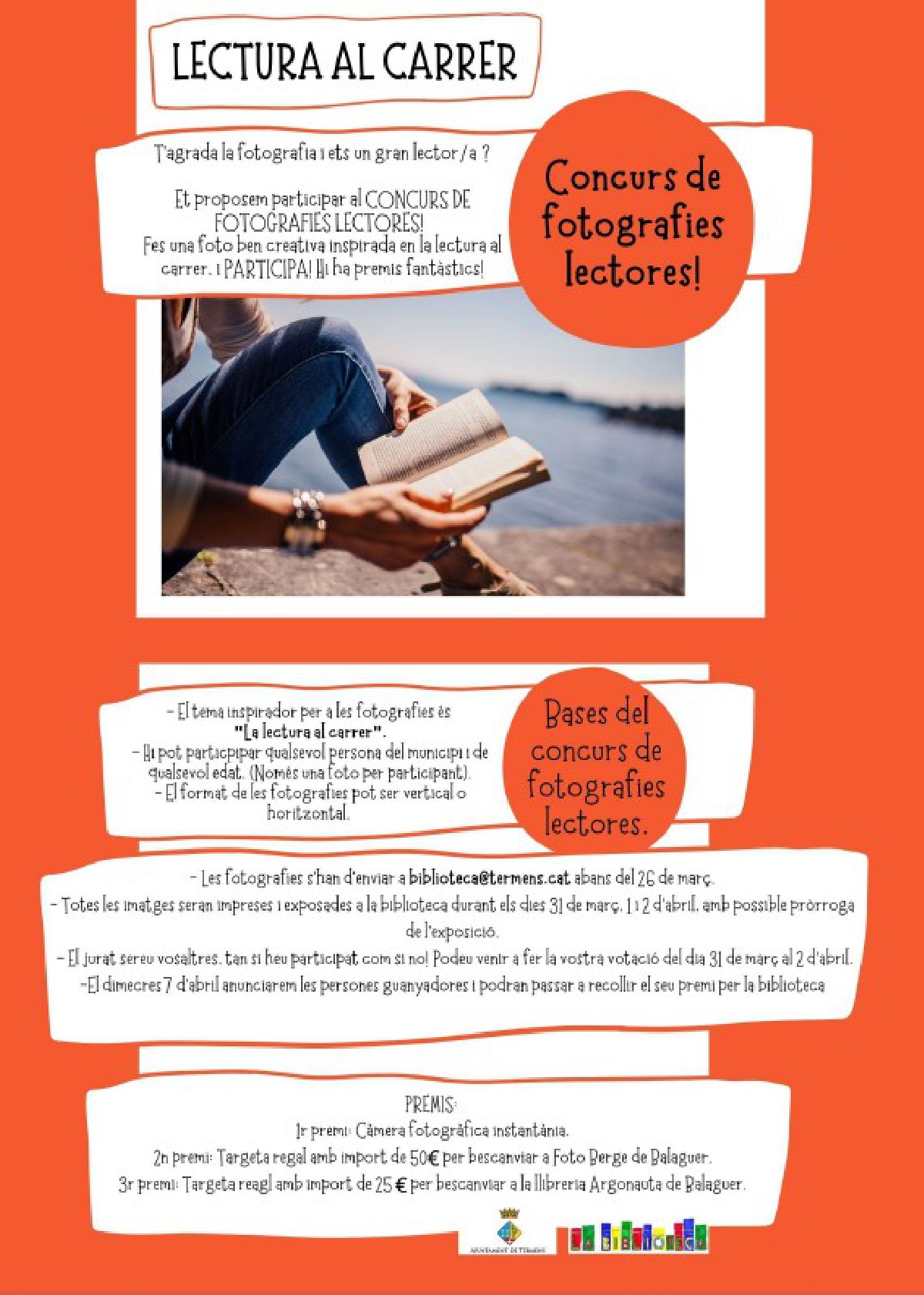 L'Ajuntament de Térmens i la biblioteca del municipi inicien un concurs de fotografia amb la lectura al carrer com a tema. Es tracta d'enviar una fotografia sota el tema 'La lectura al carrer' i s'adreça a veïns del municipi