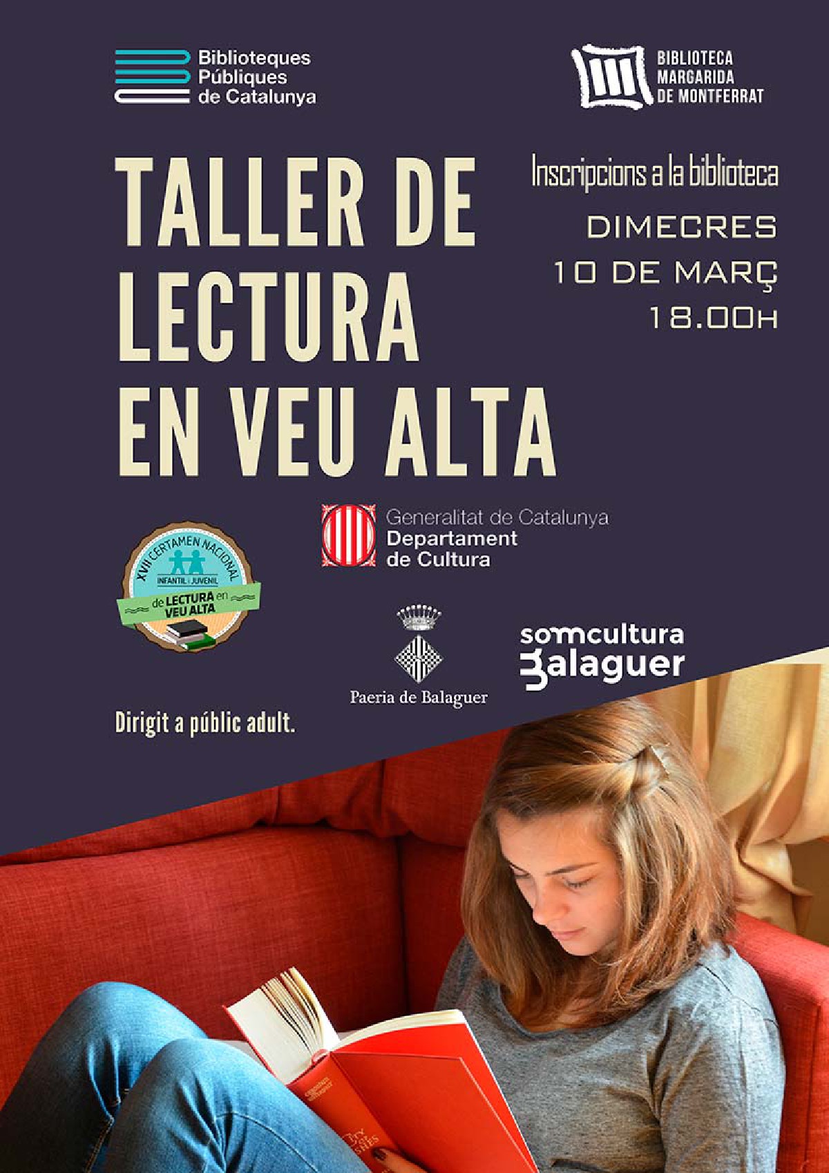 Aquest dimecres 10 de març tindrà lloc un taller de lectura en veu alta organitzat per la Biblioteca Margarida de Montferrat. Es tracta d'una activitat virtual per a públic adult i anirà a càrrec de Berta Giraut. Encara queden places per participar al t