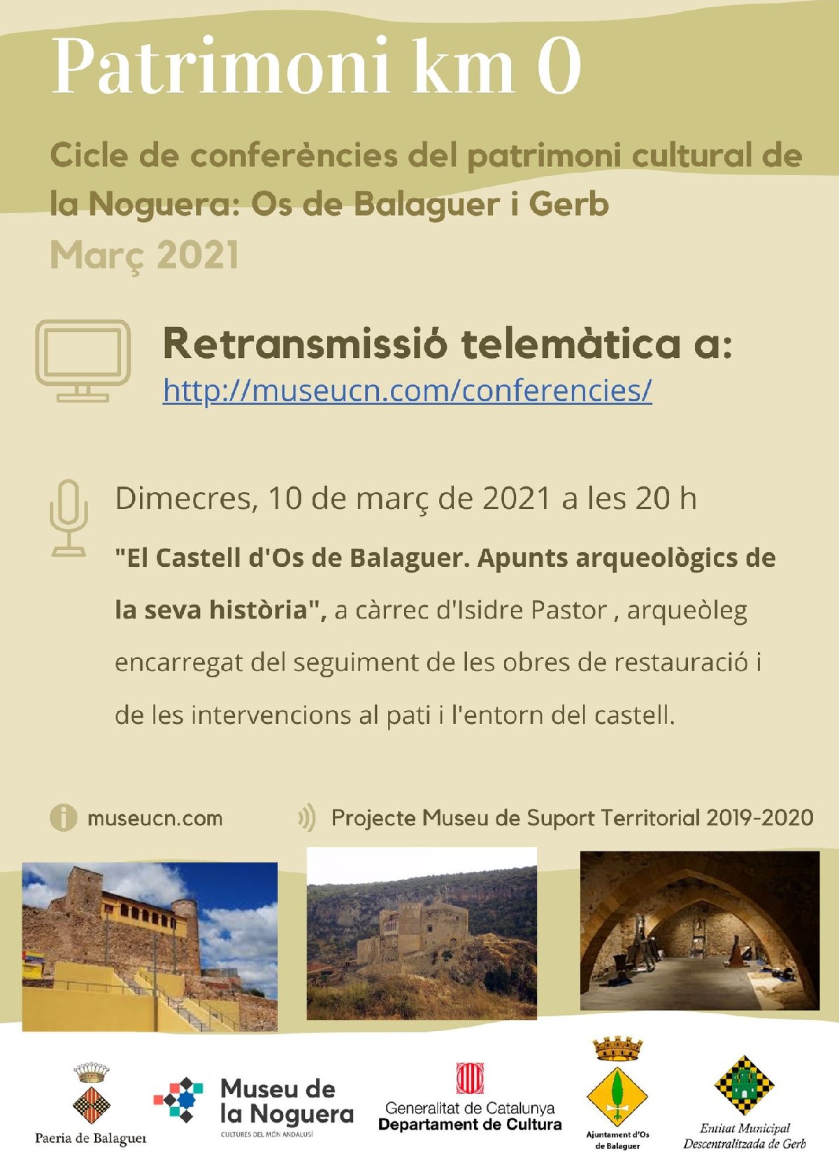 Continua el cicle de conferències 'Patrimoni Km 0' . Aquest dimecres es parlarà del Castell d'Os de Balaguer amb l'arqueòleg ISIDRE PASTOR. Es podrà seguir de forma telemàtica a les 20h a http://museucn.com/conferencies/