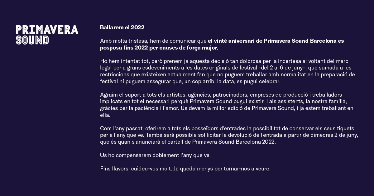 El Primavera Sound cancel·la l'edició d'aquest any i ajorna la celebració del 20è aniversari al 2022. El festival celebrarà del 2 a 4 de juny el Primavera Pro, una trobada en format híbrid sobre la indústria musical