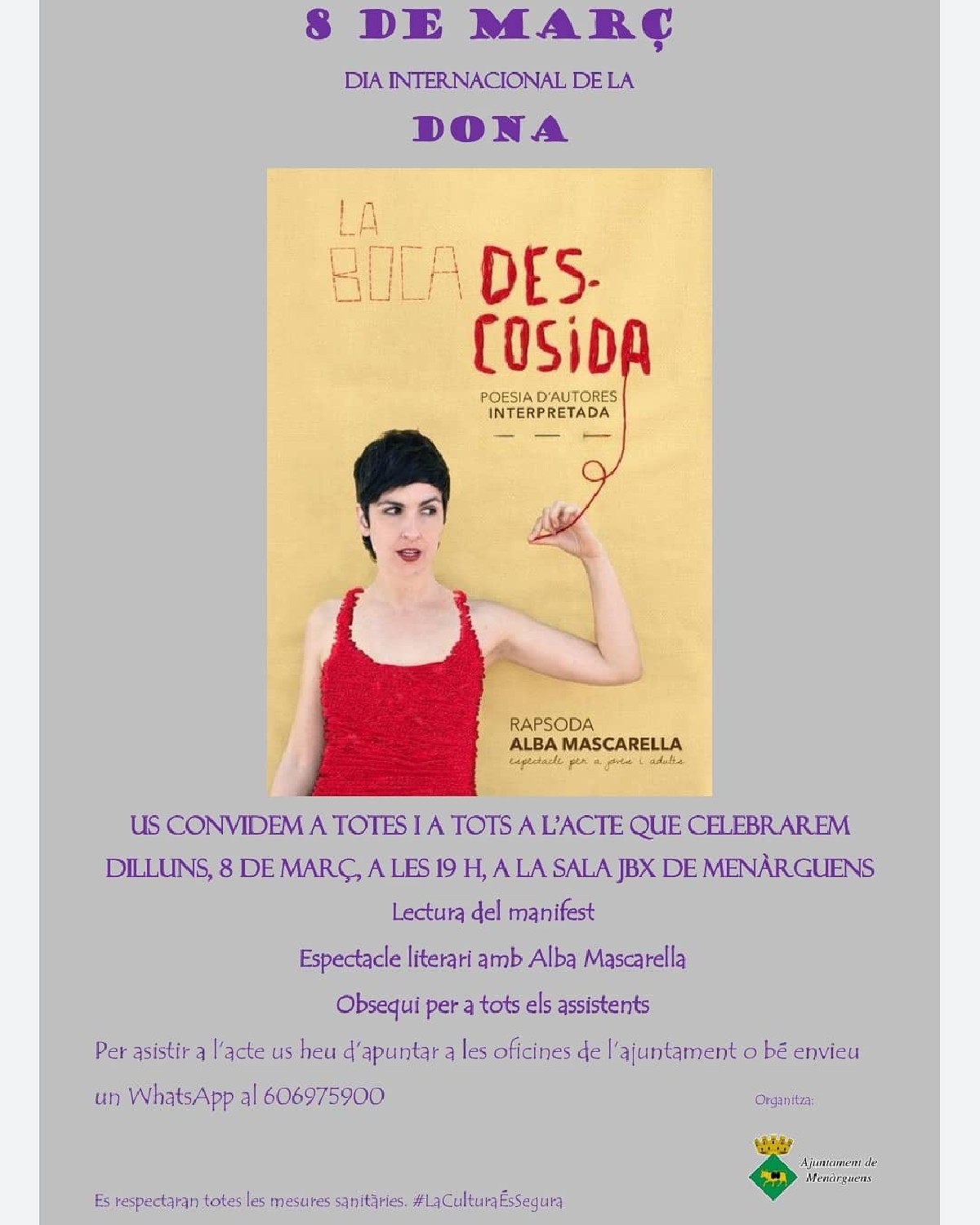 Menàrguens celebrarà el Dia Internacional de la Dona amb un acte el proper dilluns 8 de març, en que es llegirà el manifest i s'oferirà un espectacle literari amb Alba Mascarella