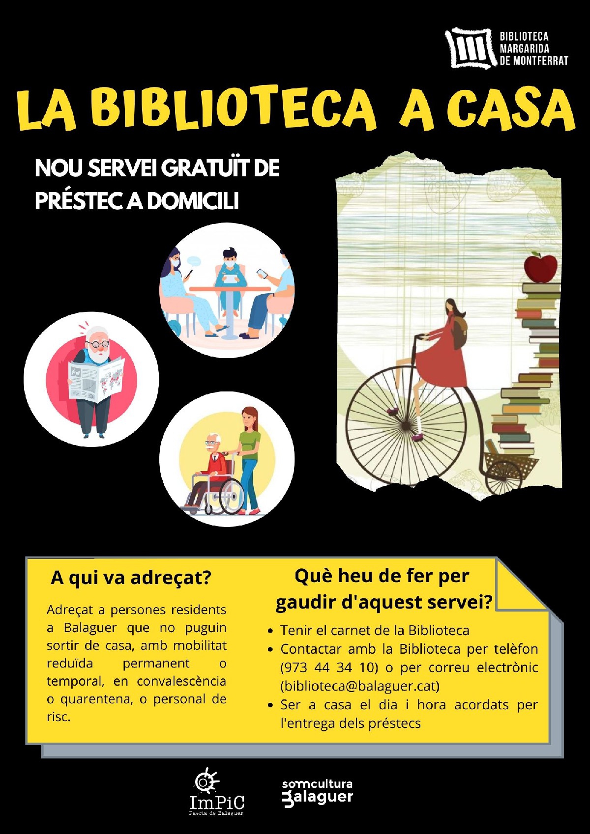 La Biblioteca de Balaguer inicia aquest dilluns un nou servei de préstec a domicili. La iniciativa dona la possibilitat a les persones que no poden desplaçar-se per la situació actual a accedir al fons de la biblioteca amb aquest servei