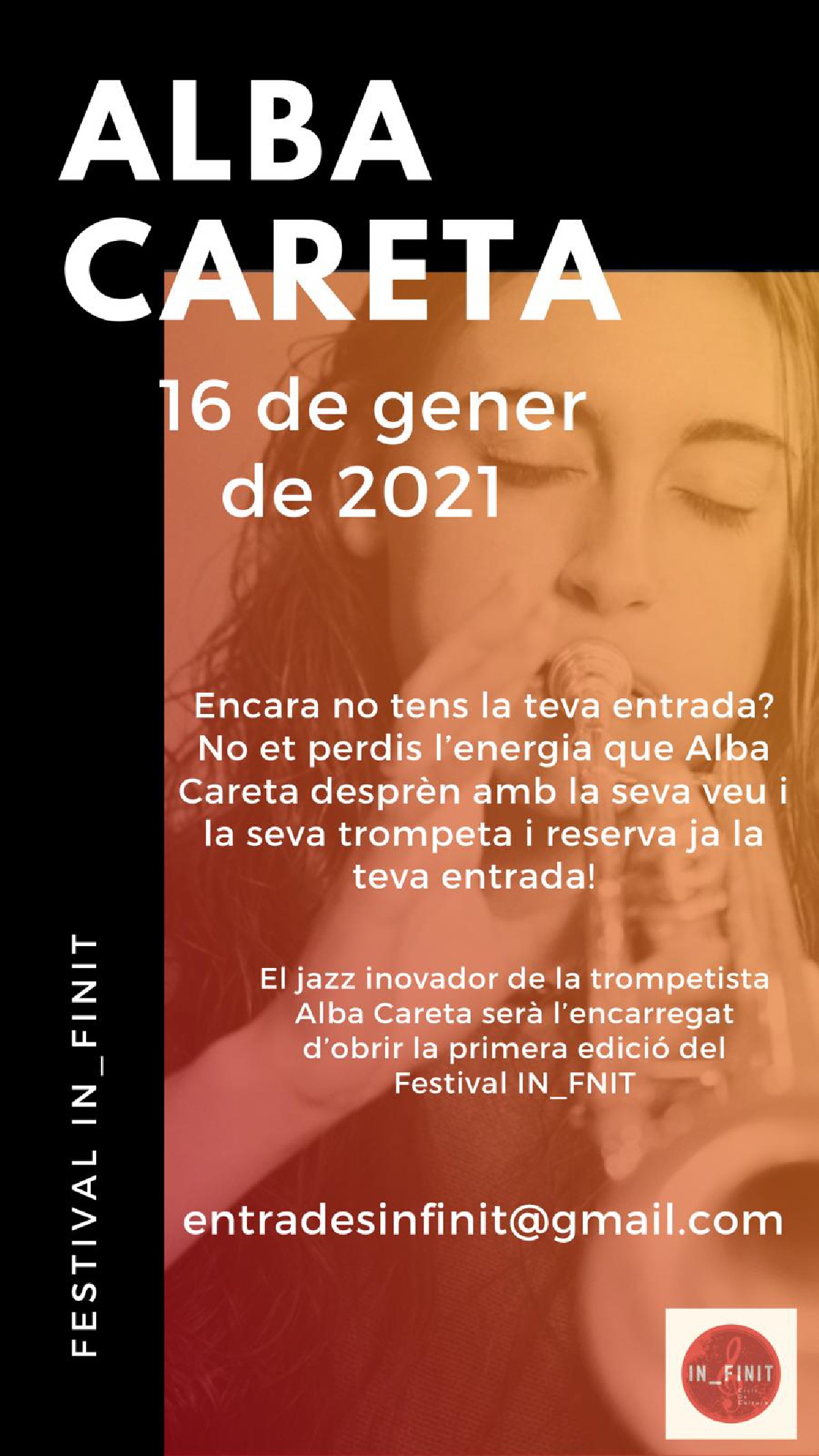 Aquest dissabte dia 16 de gener arrenca IN_FINIT, el nou cicle de cultura de Menàrguens. Ho farà amb el concert de la trompetista i cantant Alba Careta, acompanyada del seu quintet de jazz