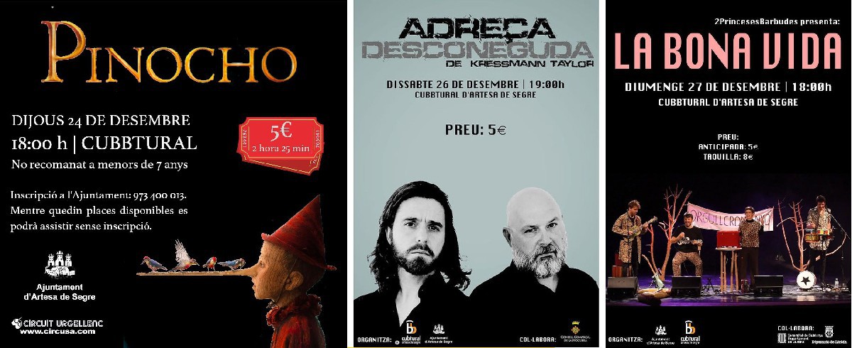 El Cubbtural d'Artesa de Segre programa un Nadal amb cinema, teatre i música. S'hi projectarà la pel·lícula 'Pinocho', es representarà l'obra 'Adreça desconeguda' i hi actuaran 2 princeses barbudes