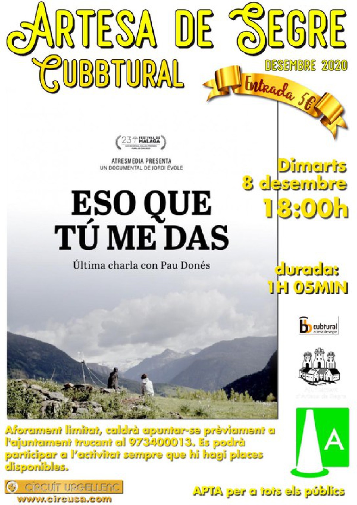El Cubbtural d'Artesa de Segre acollirà aquest dimarts 8 de desembre a les 6 de la tarda la projecció del documental 'Eso que tu me das'