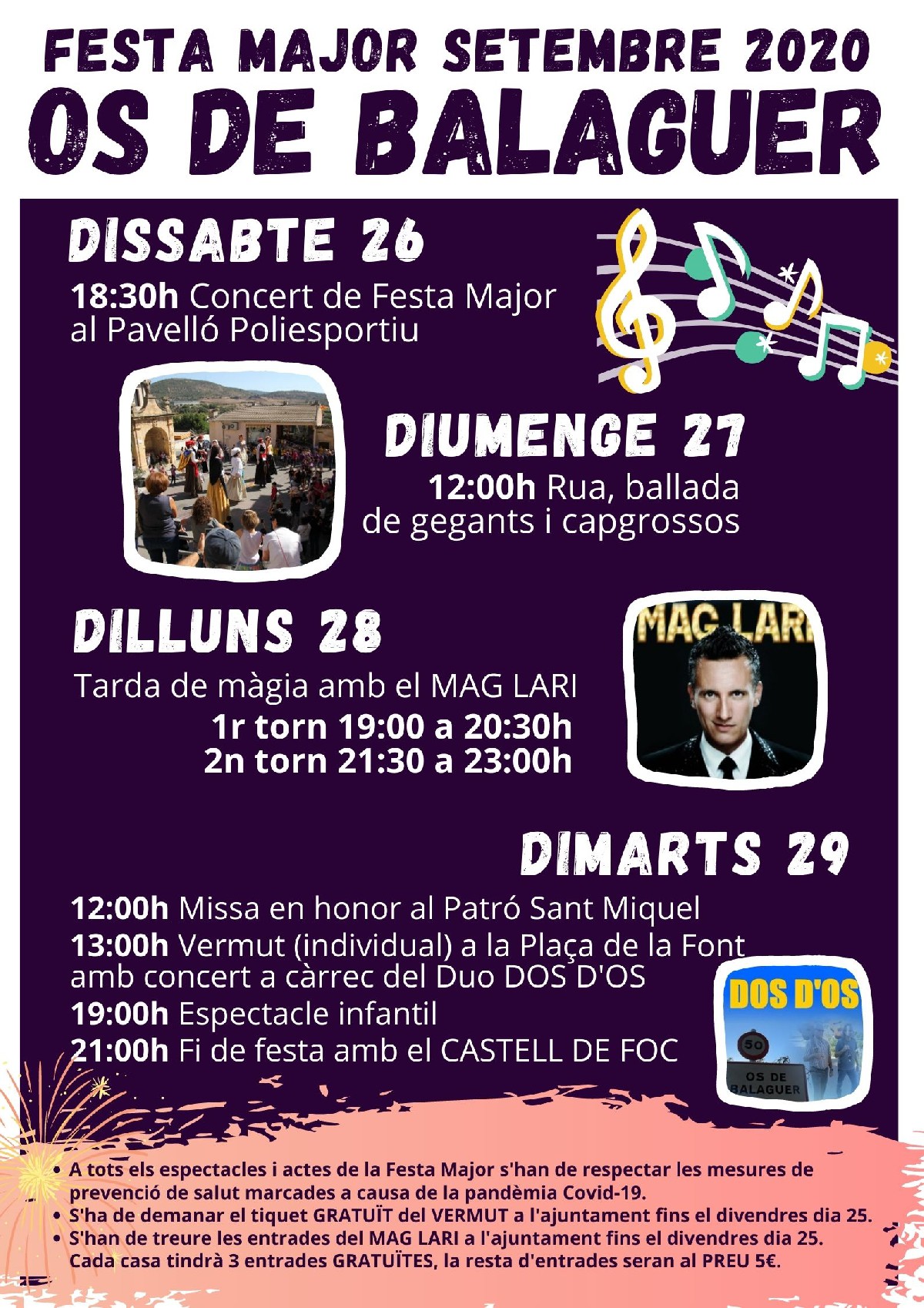 Os de Balaguer celebra aquest cap de setmana la seva Festa Major, que manté el concerts, la ballada de gegants i l'espectacle infantil, tot i la situació actual. A més incorpora un espectacle del Mag Lari el dilluns dia 28 en 2 torns