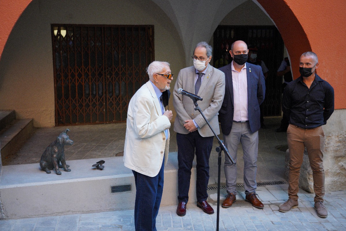 Quim Torra presideix a Balaguer l'acte inaugural de l'escultura del Rovelló, el popular gos creat per Josep Vallverdú. Ho ha fet a la plaça del Pou en el marc de l'Encontats i l'acte d'homenatge que la Paeria ha volgut retre a l'escriptor