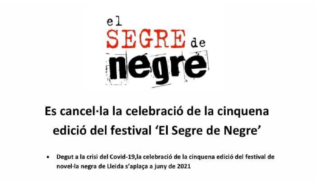 Es cancel·la la cinquena edició del festival 'El Segre de Negre'. El certamen lleidatà dedicat a la novel·la negra programat pel 29 i 30 de maig es farà al juny de 2021