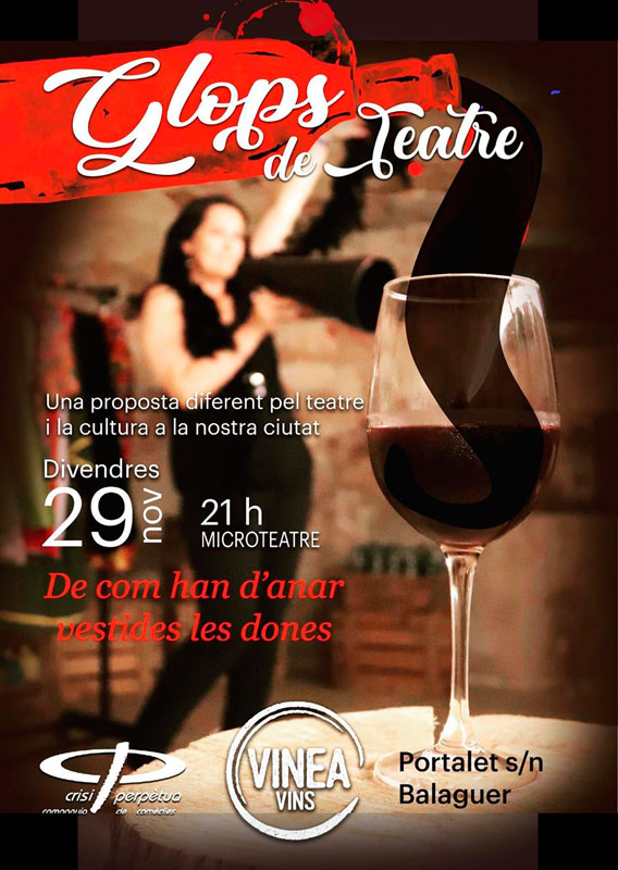 Aquest divendres 29 de novembre a les 9 de la nit al Vinea Vins de Balaguer, la companyia de teatre Crisi Perpètua presentarà un nou espectacle de la sèrie dels Glops de teatre. Es tracta d'un esquetx 'De com han d'anar vestides les dones'.