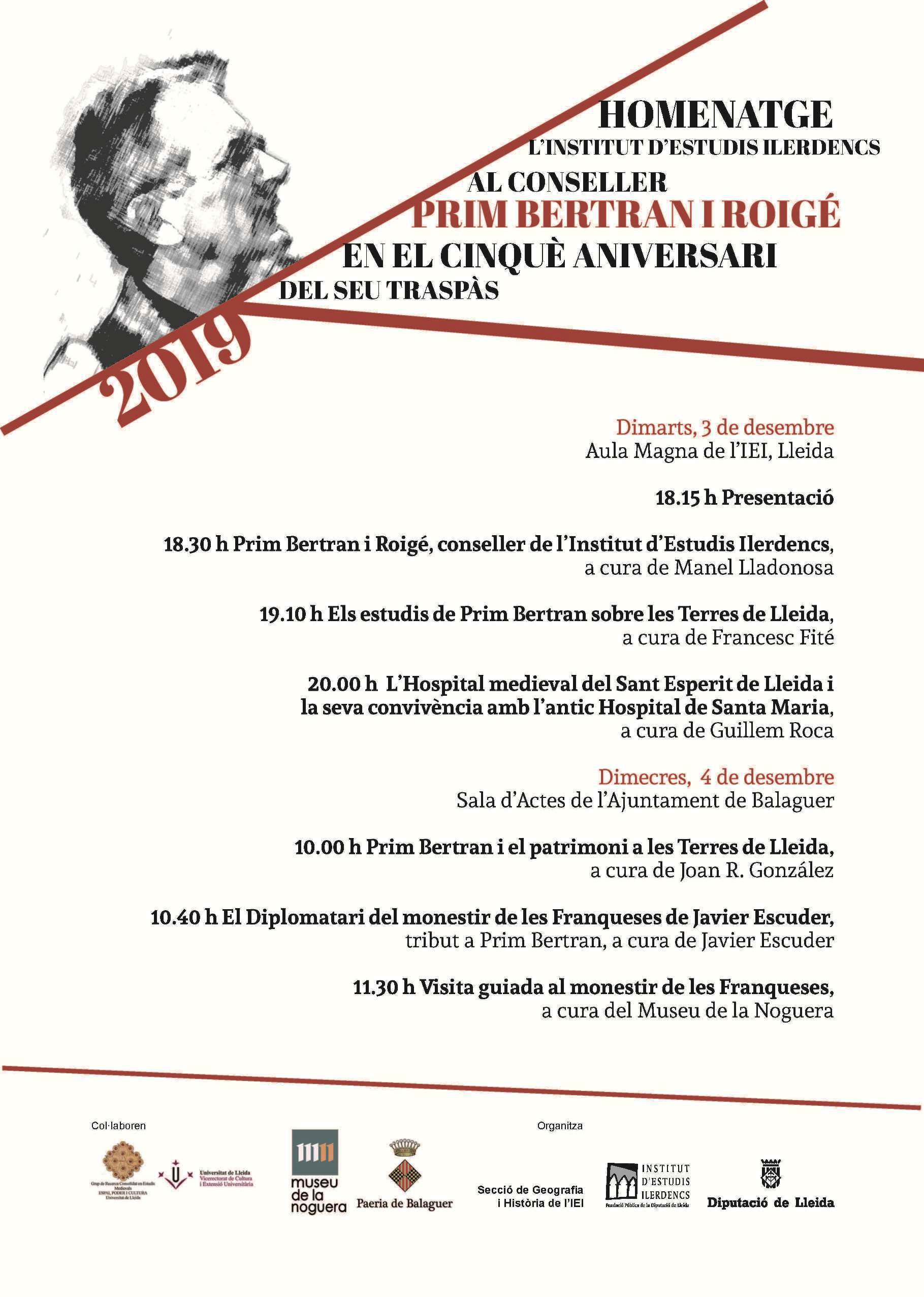 El proper dimecres dia 4 de desembre es durà a terme a Balaguer un acte d'homenatge a l'historiador Prim Bertran i Roigé en el 5è aniversari del seu traspàs.