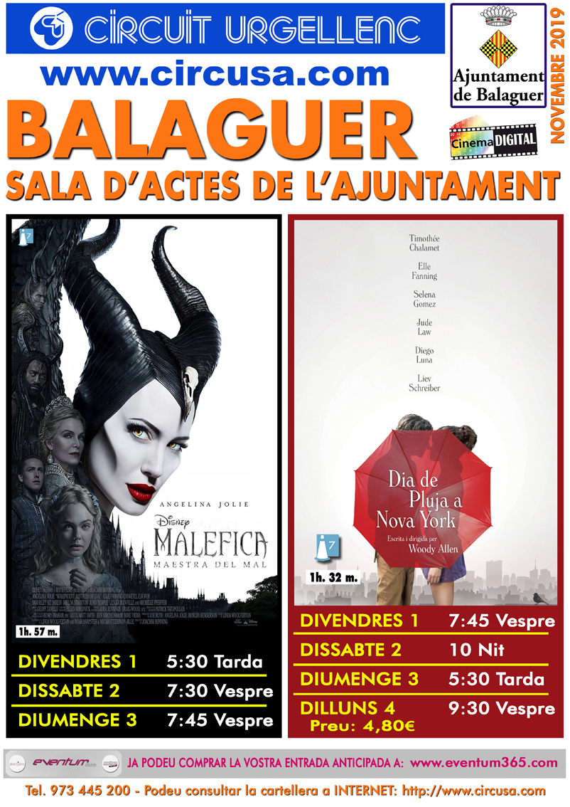 Aquest cap de setmana al Cinema Balaguer es podran veure dues noves pel·lícules, 'MALÉFICA, Reina del mal' i 'DIA DE PLUJA A NOVA YORK'.