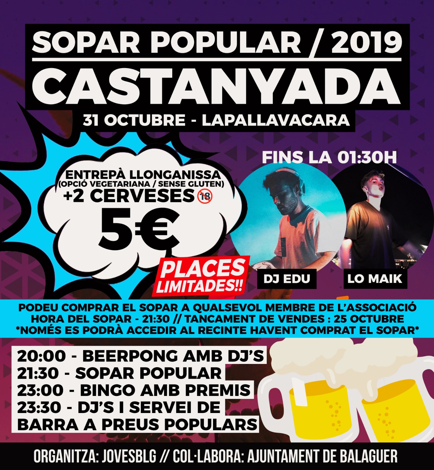 La Paeria de Balaguer i l'associació Joves BLG organitzen per primer cop un sopar popular jove de Castanyada.